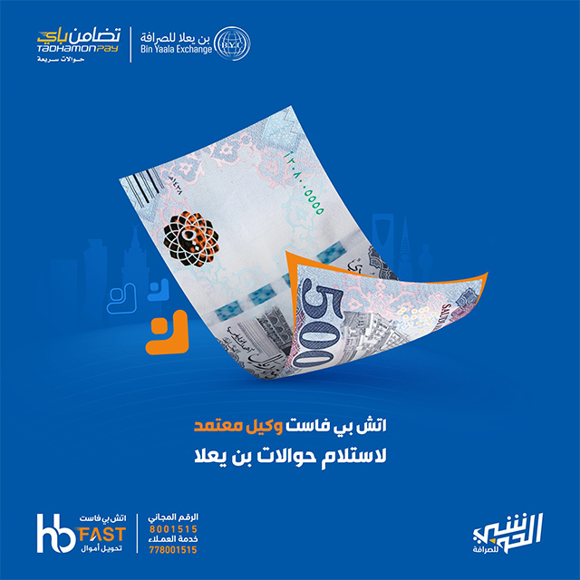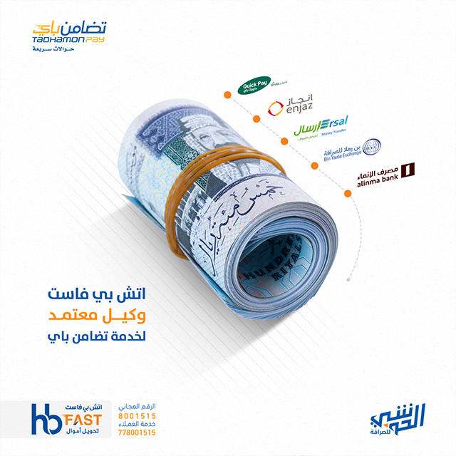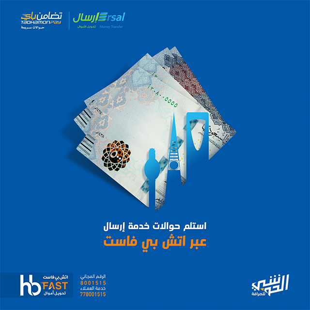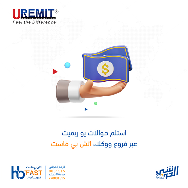 خدمة تحويل أموال تمتاز بالسرعة والأمان تمكن جميع المغتربين اليمنيين من إرسال الأموال إلى أقاربهم في مختلف محافظات الجمهورية اليمنية، كما تقدم الخدمة في محافظات الجمهورية اليمنية عبر أكثر من 850 وكيل من شركات الصرافة المرخصة والتي تمتلك سمعة جيدة في السوق.